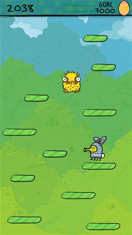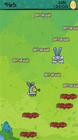 那么我们就直接一点,开始跳跃之旅吧。该游戏操作方法和前作一样,依靠重力感应来控制跳蚤跳跃的方向,只要玩家踩到踏板上,那么小跳蚤就会继续往上跳,直到累计跳跃高度达到右上角所显示的终点高度,才可以拿到彩蛋并过关。而点击屏幕则会让跳蚤吐出"子弹",目的是为了清除上升途中可能遇到的怪物。不过除了使用子弹来消灭怪物之外,玩家还可以把怪物当成一个踏板,在踩踏消灭它的同时还可以向上跳跃,这一点还是挺值得赞许的。